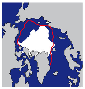 2. ábra: A NASA ábrája az Északi-sarkvidék jégtakarójának kiterjedéséről 2008. szeptember 12-én. A piros vonal azt mutatja, hogy mekkora volt a jég kiterjedése e ugyanezen a napon átlagosan 1979 és 2000 közöt.